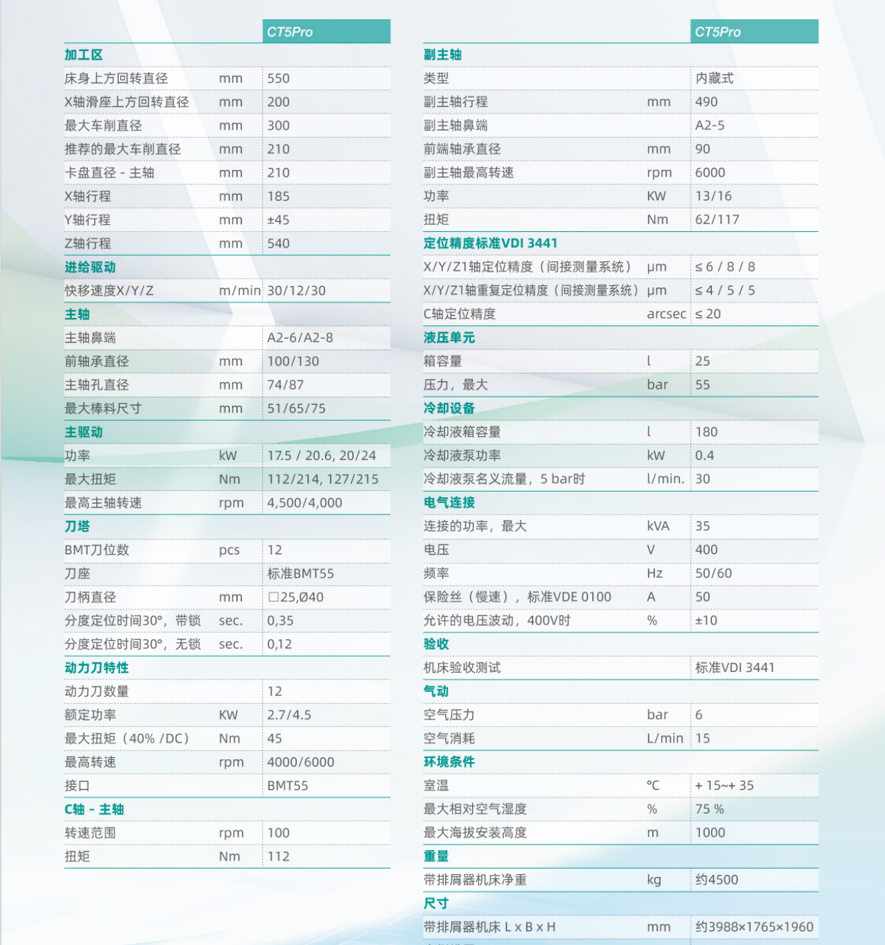 CT5 Pro 雙主軸雙刀塔機(jī)型,正副主軸標(biāo)配電主軸,正主軸4500rpm,副主軸5000rpm。上下刀塔標(biāo)配12T,BMT55動(dòng)力刀塔;上下刀塔帶Y軸,Y軸行程為±45mm。